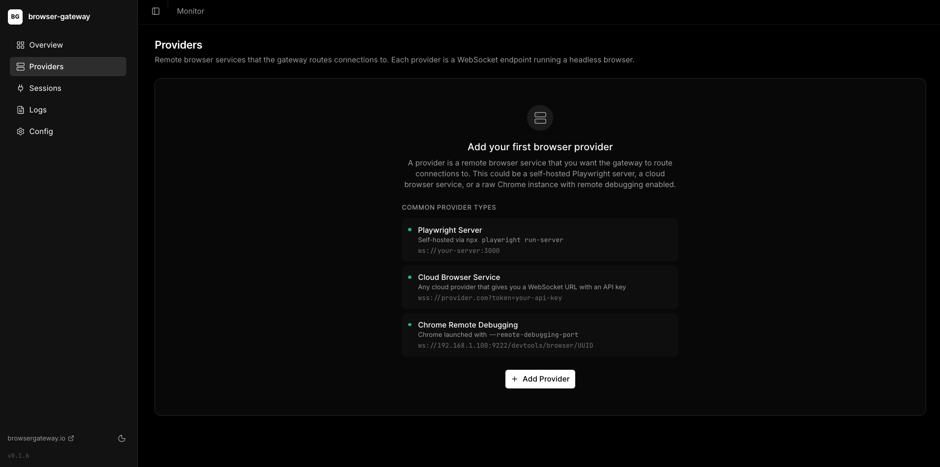$npx browser-gateway serveStarts the gateway, dashboard, and MCP server on one port